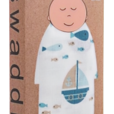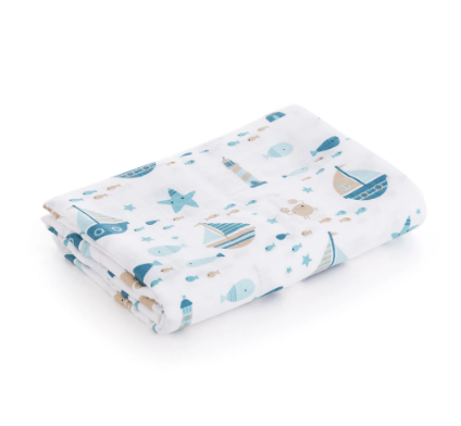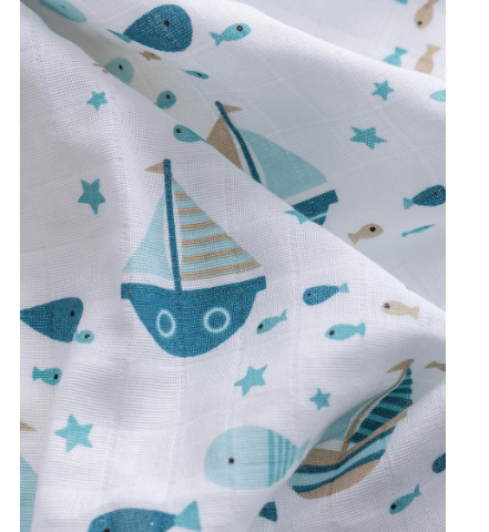 Baby & Kids - White Colour Swaddle with Pattern + 4 pieces mouth tissue - Boat Pattern Blue